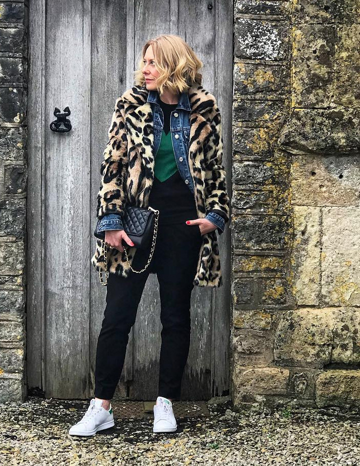 15. Mais um look dela, também de tênis, com sobreposição de blusa bicolor, jaqueta jeans e casaco teddy bear de estampa de oncinha diferente do primeiro.
